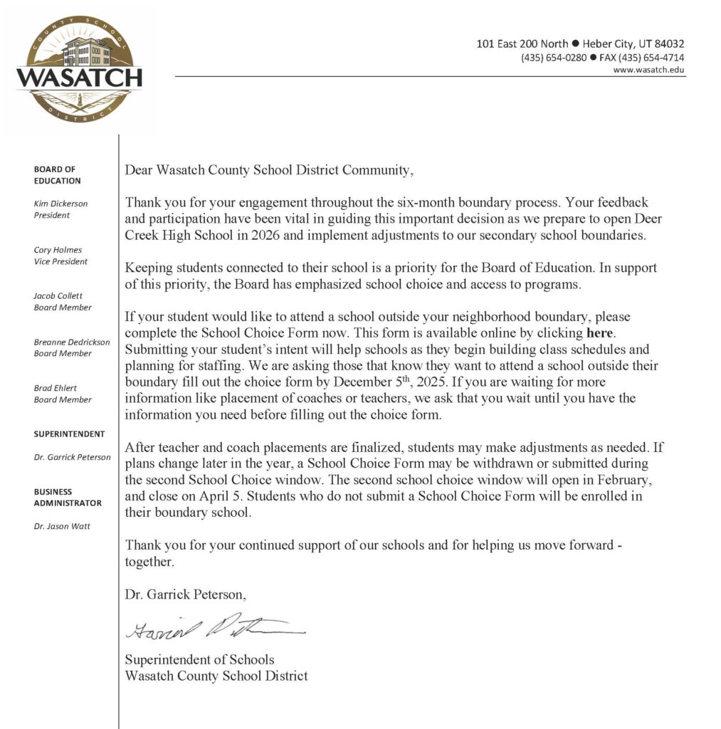 As Wasatch County continues to grow exponentially, it has become necessary for the District to examine School Choice procedures to ensure that we have room at each school to accommodate the students within that school’s boundaries. To that end, we are introducing a new School Choice policy, the result of which is to close open enrollment at the schools listed below to students who live outside the boundaries. Students who currently attend, but live outside the boundaries of, a closed school will be able to continue attending that school.