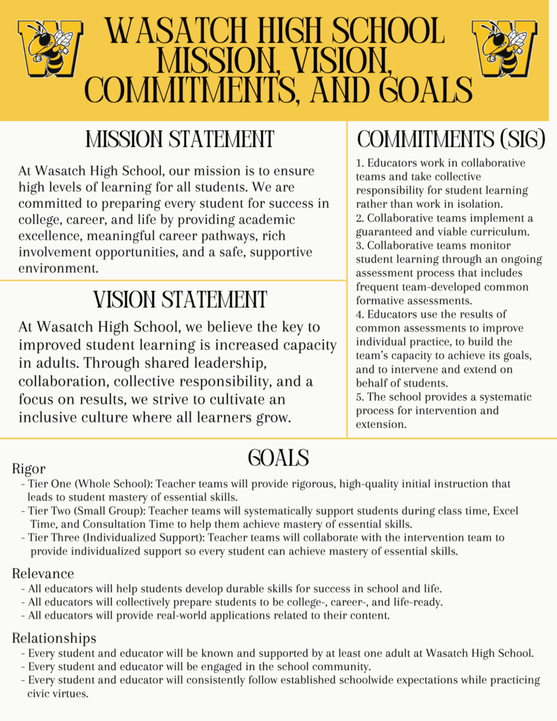 At Wasatch High School, our mission is to ensure high levels of learning for all students. We are committed to preparing every student for success in college, career, and life by providing academic excellence, meaningful career pathways, rich involvement opportunities, and a safe, supportive environment.